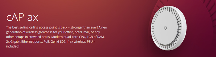 cAP ax cuenta con una moderna CPU de cuatro núcleos a 1,8 GHz, almacenamiento NAND y un gigabyte de RAM. ¡Suficiente para aprovechar al máximo el software de red más potente del mercado: RouterOS v7! Reglas de firewall complejas, cifrado de hardware IPsec, Wireguard, BGP, enrutamiento avanzado o múltiples túneles VPN para trabajo remoto: ¡cAP ax lo tiene todo!