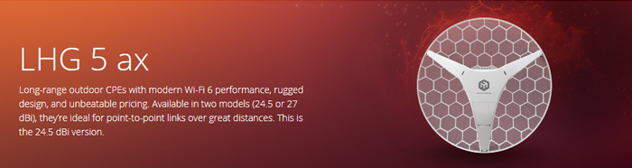 El LHG 5 ax es un CPE compacto de largo alcance con una antena de 24,5 dBi. Perfecto para enlaces de hasta 20 km en la mayoría de los casos. Si necesita mayor alcance, consulte la versión XL de los dispositivos relacionados que aparecen a continuación.