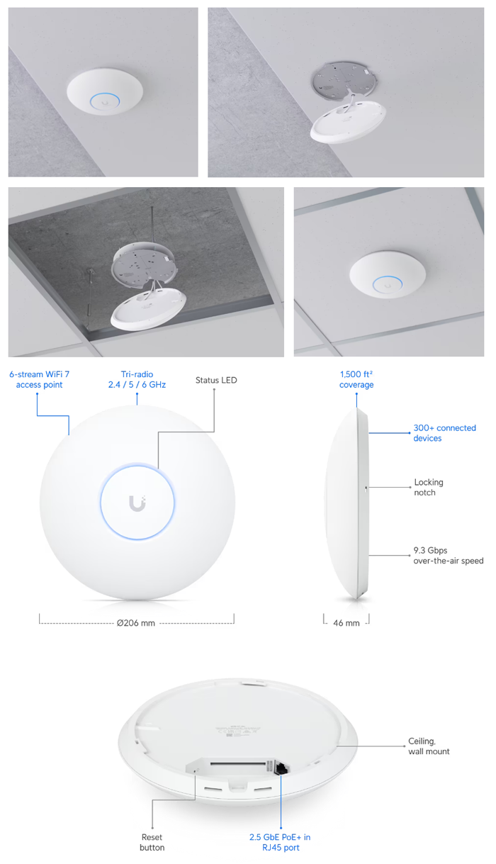 Punto de acceso WiFi 7 para montaje en techo con 6 transmisiones espaciales y soporte de 6 GHz para WiFi sin interferencias en entornos exigentes y de gran escala.