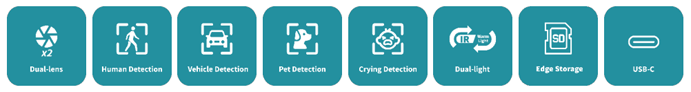 Motion detection, Ultra motion detection(pedestrian/motor vehicle/pet), Loud Sound Detection, Crying detection, Tampering alarm |