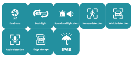 Detección de movimiento, detección de movimiento ultra (basada en detección de cuerpo humano y vehículo), alarma antimanipulación, detección de audio |
