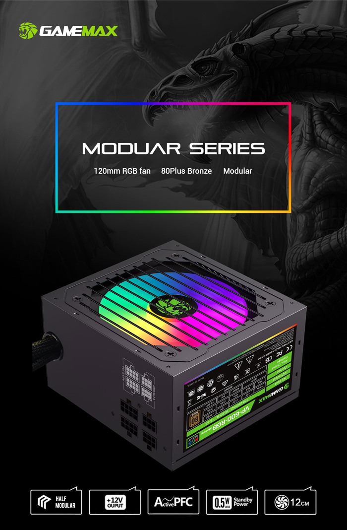 La fuente de alimentación de la serie GameMax VP Modular RGB está diseñada para brindar calidad, rendimiento y un increíble ahorro de energía gracias a su alta eficiencia de hasta el 85 %.