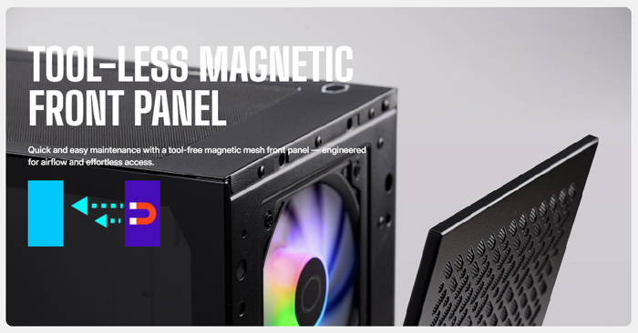 El Elite 302 cuenta con una amplia rejilla de entrada de aire y tres ventiladores ARGB de 120 mm para garantizar un funcionamiento fluido y eficiente del sistema. El revestimiento completamente negro y la cubierta de la fuente de alimentación incluida permiten configuraciones limpias, visualmente atractivas y funcionales.