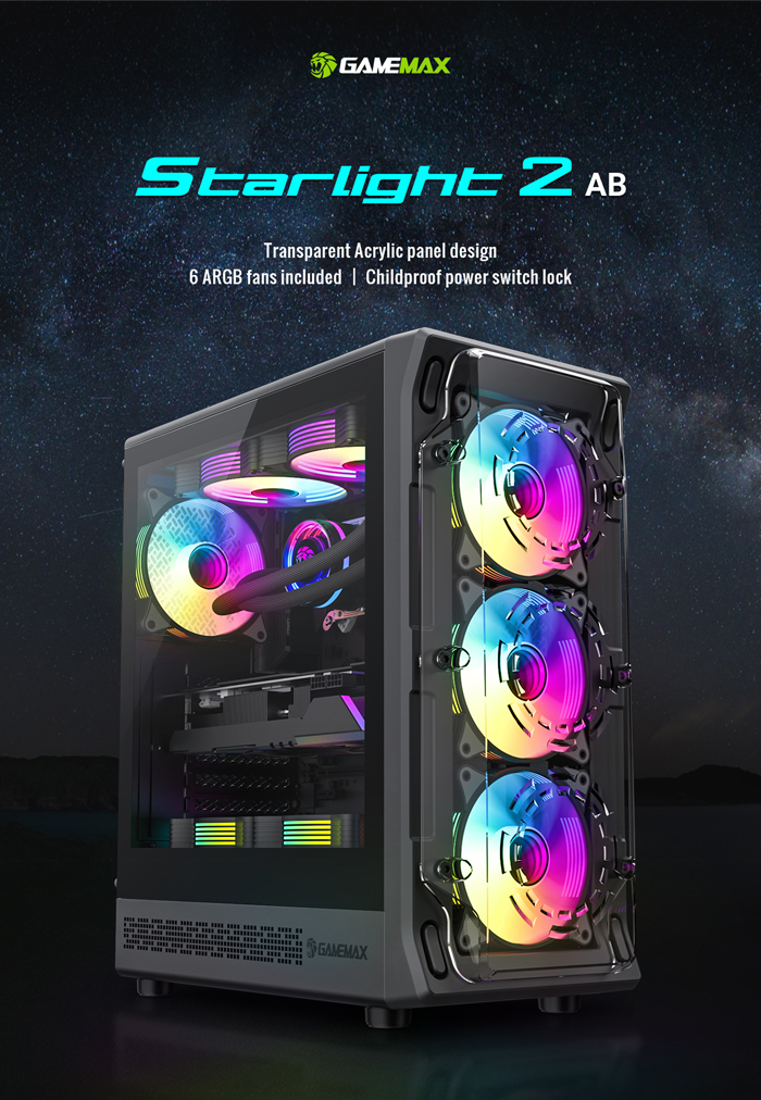 Caja para PC Starlight 2 AB Mid Tower negra con panel lateral de vidrio templado, excelente refrigeración y almacenamiento versátil