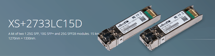 A kit of two 1.25G SFP, 10G SFP+ and 25G SFP28 modules. 15 km, 1270nm + 1330nm.