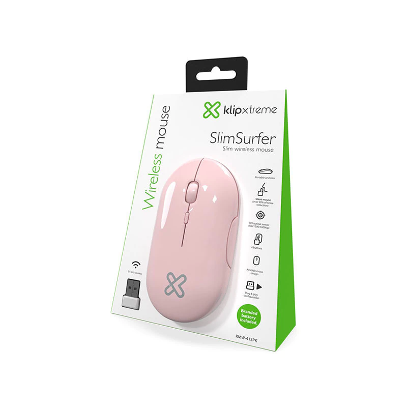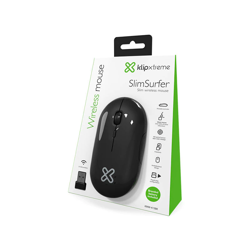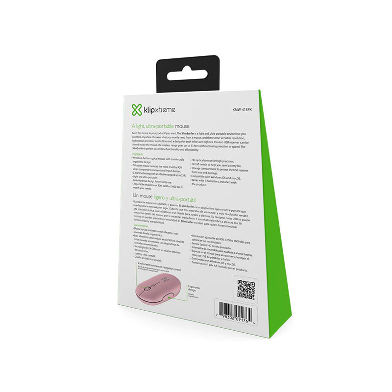 Guarde este mouse en su bolsillo si lo desea. El SlimSurfer es un dispositivo ligero y ultraportátil que puedes guardar en cualquier lugar. Cubre lo que más necesita de un mouse, y más: resolución versátil, alta precisión óptica, cuatro botones y un diseño tanto para zurdos como para diestros. Su receptor nano USB se puede almacenar dentro del mouse. Su alcance inalámbrico llega hasta los 33 pies sin perder precisión ni velocidad. El SlimSurfer es perfecto para combinar funcionalidad y asequibilidad.