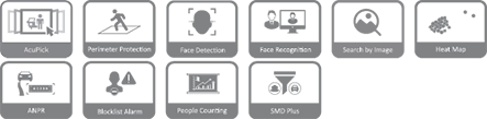 > AI by Recorder admite detección y reconocimiento de rostros de 2 canales, hasta 20 bases de datos de rostros y 20 000 imágenes de rostros; protección perimetral de 4 canales; SMD Plus de 8 canales.