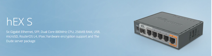 5x Gigabit Ethernet, SFP, Dual Core 880MHz CPU, 256MB RAM, USB, microSD, RouterOS L4, IPsec hardware encryption support and The Dude server package