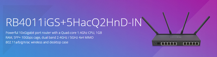 Potente enrutador de 10 puertos Gigabit con CPU de cuatro núcleos a 1,4 GHz, 1 GB de RAM, jaula SFP+ de 10 Gbps, banda dual 2,4 GHz/5 GHz 4x4 MIMO 802.11a/b/g/n/ac inalámbrica y carcasa de escritorio.