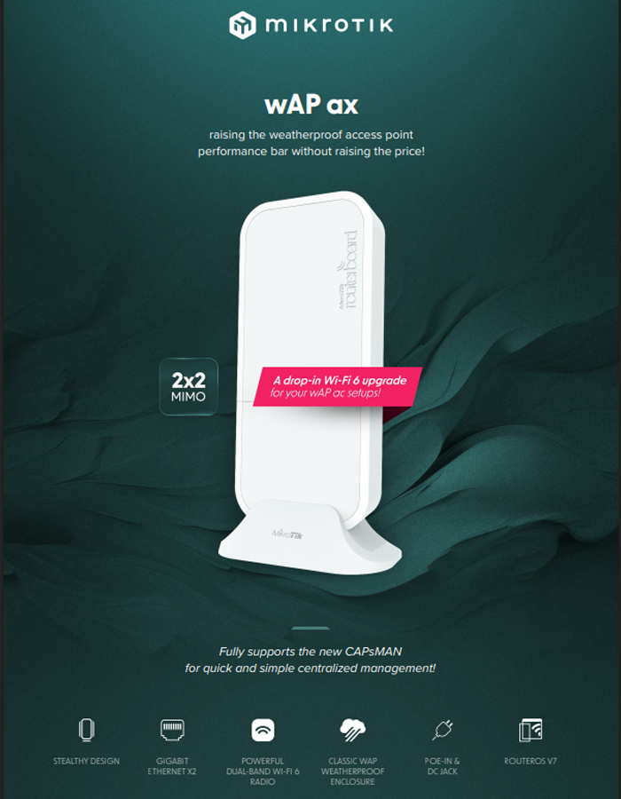 Este punto de acceso compacto está equipado con una moderna CPU ARM de doble núcleo y funciona con RouterOS v7 , lo que garantiza una conexión a internet estable y un excelente rendimiento de VPN en toda su propiedad. El wAP ax también es compatible con nuestro nuevo CAPsMAN para una gestión centralizada y sencilla de múltiples dispositivos con solo unos clics.