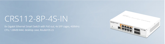CRS112-8P-4S-IN es un conmutador PoE de ocho puertos RJ45 Gigabit que ofrece diferentes opciones de salida de potencia: detección automática de PoE/PoE+ 802.3af/at y PoE pasivo, y cuatro puertos SFP brindan opciones de conectividad de fibra óptica para admitir enlaces ascendentes de hasta 1 Gbps.