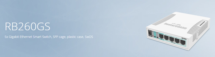 El RB260GS es un pequeño switch SOHO. Cuenta con cinco puertos Gigabit Ethernet y una caja SFP alimentada por un chip Atheros Switch.