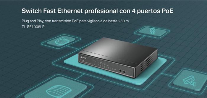 • Puertos 8 × 10/100 Mbps RJ45 (los puertos 1–4 admiten 802.3af PoE) • Autonegociación • AUTO MDI / MDIX |