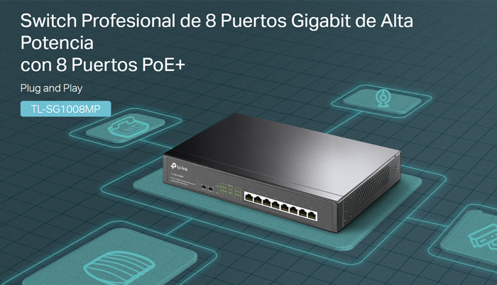 Equipado con 8 puertos PoE+ que permiten la transferencia de datos y energía en un solo cable
