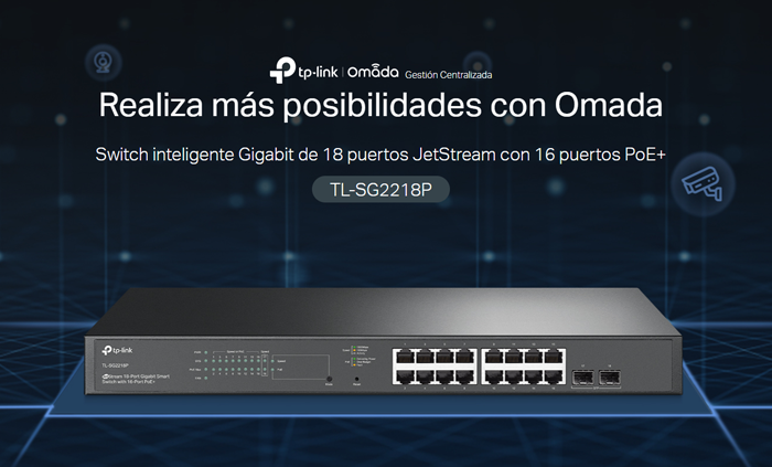 Puertos Gigabit completos: 16 puertos Gigabit PoE+ y 2 ranuras SFP Gigabit que ofrecen conexiones de alta velocidad.