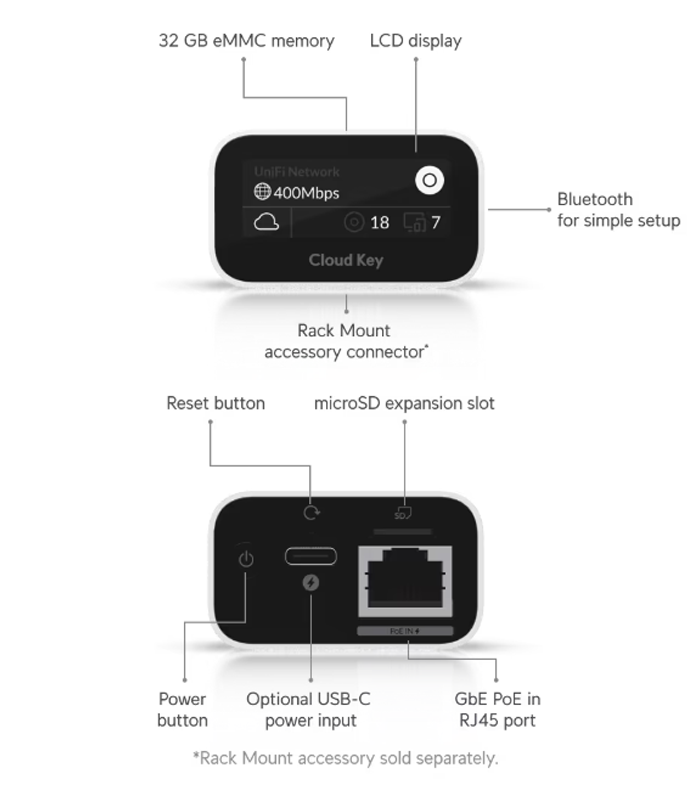 Consola UniFi compacta que se conecta directamente al Administrador del sitio en https://unifi.ui.com/ y administra redes UniFi de pequeña a mediana escala.