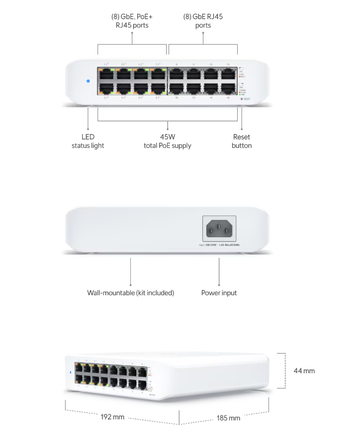 Un conmutador PoE de capa 2, de 16 puertos y montable en pared con un sistema de refrigeración sin ventilador.